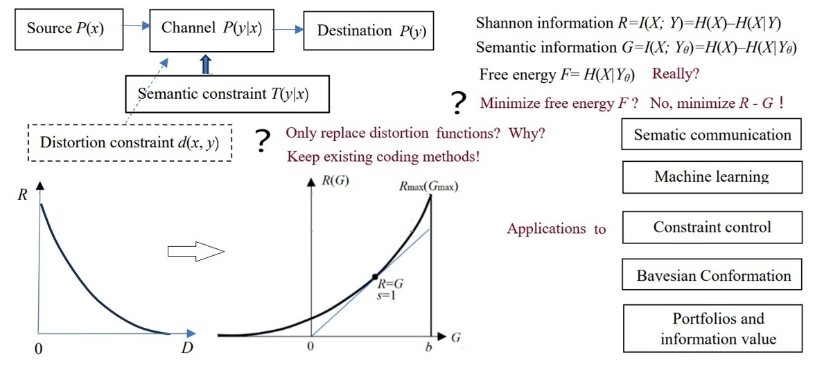 关键词: 语义信息论,语义信息测度,信息率失真,信息率逼真,变分贝叶斯,最小自由能,最大信息效率,投资组合,信息价值,约束控制. 。