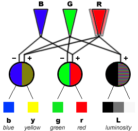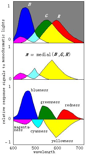 鲁晨光:译码模型:一个对称的色觉机制模型,见http://survivor99.com/lcg/my/colormodel.htm