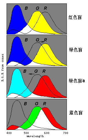 图 8 色盲图解(横坐标波长;纵坐标:信号强度)蓝色盲可以想象B曲线向G曲线靠拢,以至合二为一。 各种色盲也可以通过让模拟电路中两个或三个3DU接收相同的输入信号来模拟。 另外,我们也可以想象绿色盲是因为G曲线合并到B曲线而不是R曲线中了,这样一来,人的色觉就有所不同,不是产生正常人的蓝黄两种感觉,而时正常人的红青两种感觉, 如图中绿色盲a所示。 然而,后面我们将证明,绿色盲a和绿色盲完全等价,不可区分;或者说,一个先天的绿色盲患者不可能知道自己是两种(甚至更多种)绿色盲中的哪一种,其他任何人也不会知道。 上面我们是用物理颜色来表示色觉的,而严格说来,色觉本身是不可表示的,我们只是表示了不同色觉的差异,并没有表示出色觉本身。所以图16中的绿色盲和绿色盲a两种表示完全等价。7. 译码模型新问题 和流行的阶段模型不同的是,译码模型是对称的,有三对互补色、六种单纯彩色(unique colors)或感觉信号。我以为理想的色觉机制应该有6种单纯彩色(加上黑白一共是8种――2的3次方)。有人或许认为心理学实验已经证明四种单纯彩色存在, 因而产生六种纯彩色的模型是不合理的。 然而,笔者坚持自己的观点有不少理由,参看:http://survivor99.com/lcg/books/color/2-7.htm 主要理由是:颜色视觉正在进化,我们能想象单纯彩色的数目正在由四种变为六种,红青和绿绛两种互补色比较接近,没有被生理学试验分开。这也是因为指导思想不同的缘故。 上面模型和流行的BGR->HSV转换 (用于Photoshop)是一致的. 参看:http://www.easyrgb.com/math.php?MATH=M20#text20 |