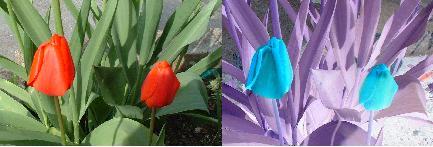 1 引言 Young和Helmholtz的三色素理论同Hering的互补色理论一直竞争了很长时间。 流行的色觉阶段模型(zone model)是这两种观点的折中,它认为,色觉信号处理在视细胞阶段三色素信号形式存在,从视网膜的神经节细胞输出到大脑的以互补色(opponent colors)信号形式存在。生理试验支持这种观点。但是,输出的是哪些互补色信号,这是有争议的。 阶段模型说是红-绿, 兰-黄和黑-白三对互补色。 2.流行阶段模型中的互补色问题 阶段模型说的“红绿”不是日常所说的红绿,日常所说的红绿比如:电视机上的红色pixel, 和绿色pixel,或红绿彩条颜色。这两种颜色相加等于黄。但是,阶段模型种所说的红绿相加等于白。图右边是左边反色得出的,他们的颜色是互补的。