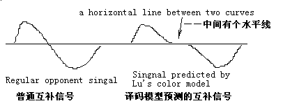 按照译码模型, 互补色信号是不连续的(见图),神经节细胞输出应当有图10右边所示的信号, 其中间有一段水平线(响应是0)。 由于人眼有些视细胞处在进化低级阶段,所以左边的普通互补信号存在也是正常的。