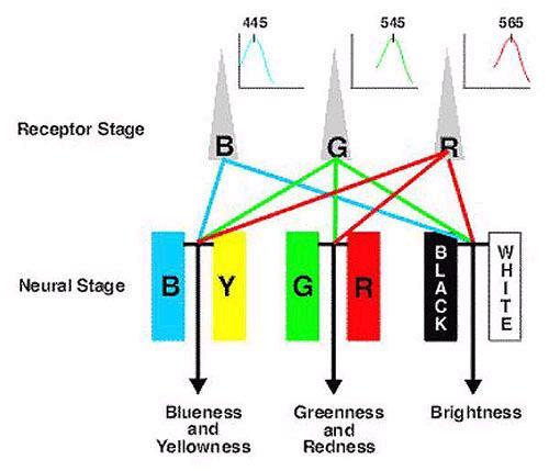 图2 阶段模型I 其基本公式是: R+G=Y(黄), Y-B=兰黄互补信,号, R-G=红绿互补信号,R+G+B=白色信号 参看网页 http://webvision.med.utah.edu/KallColor.html 问题:1)R-G产生的不可能是互补色; 2)(B,G,R)=(0,0,1)应该说典型的红色, 其他颜色信号应该说0, 但是根据这一模型,对于这一典型红色,Y>0, W>0.这是不合理的。