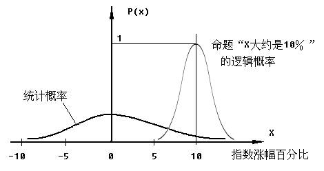 我们可以统计某个股市多年来日升跌幅的频率, 当天数大到一定程度后,相对频率(在0和1之间)就趋向某个确定值,这个值就是概率或统计概率。命题的逻辑概率是事实xi一定时,命题yj或yj(xi)被不同的人判断为真的概率。比如命题yj=“指数升幅接近10%”在指数实际升幅X=10%时被判定为真的逻辑概率是1;随着误差增大,逻辑概率渐渐变小;误差超过5%时逻辑概率接近0。
