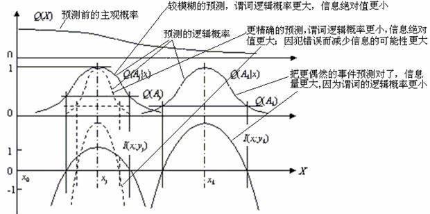 广义信息公式(14)的性质如图7所示。为了便于理解,我们不妨把图中预测理解为对股市指数、降水量、温度……或产量的预测。三个山型曲线表示三个不同预测――用以比较精确预测和模糊预测, 对更偶然事件的预测和对不很偶然事件的预测。图中结论:精确预测信息的绝对值更大,但因容易出错而更容易导致负信息;把更偶然事件预测准了信息量更大。