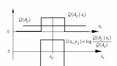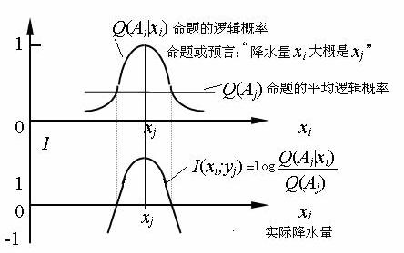 公式(14)的几何性质如图3所示。它表示,当读数是yj时, 实际发生的xi 与xjj差别越大,信息量越小。差别大到一定程度,信息量就是负的。如果把Q(Aj|xi)理解为命题yj为真的可信度函数,这个公式就可以用于语义和预言信息计算(参看图3)。