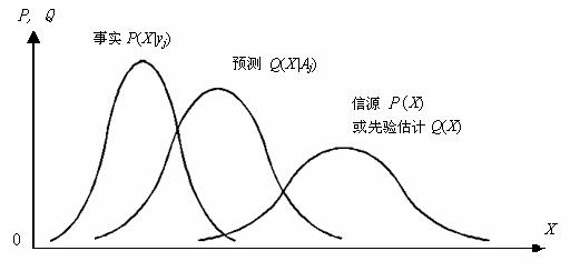 其中P(xi)也可以不是来自统计,而是来自主观估计,这时候我们记它为Q(xi)。广义Kullback信息公式的性质可以通过图4说明。可以证明,当预测Q(X|Aj)和事实P(X|yj)越是重合,信息量越大, 信源P(X)或先验估计Q(X)越是与事实P(X|yj)不同(表示预测的事情越是出乎意外),信息量越大。这和公式(14)一样,体现了Popper的科学进步评价准则。不同的是, 这里所预测的事实不是简单事件,而是时间或空间种分布的事件。