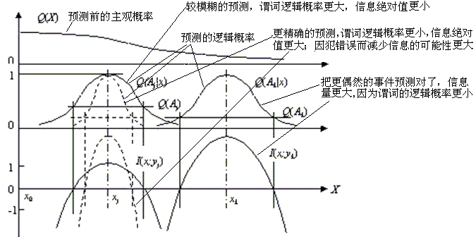 该图表明:1)语言越精确,信息量的绝对值越大,但是因预测错误而减少信息的可能性也越大;语言越模糊,信息的绝对值越小,因犯错误减少信息的可能性也越小; 2)越是把源以为偶然的信息预测对了,信息量越大,反之信息量越小。这正反映了Popper的科学进化信息准则[1]。