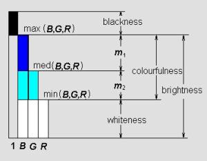 magnitude of eight color signals: blackness, redness, ..., whiteness (see Table
